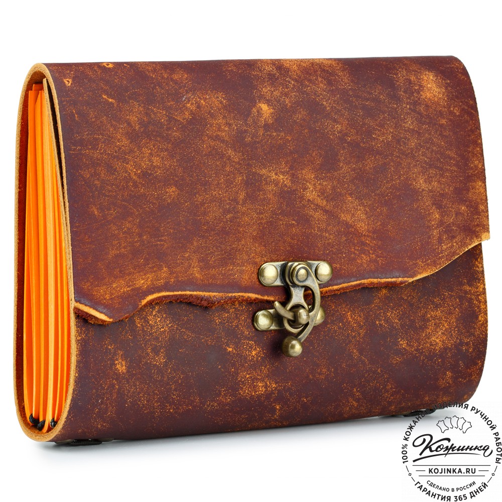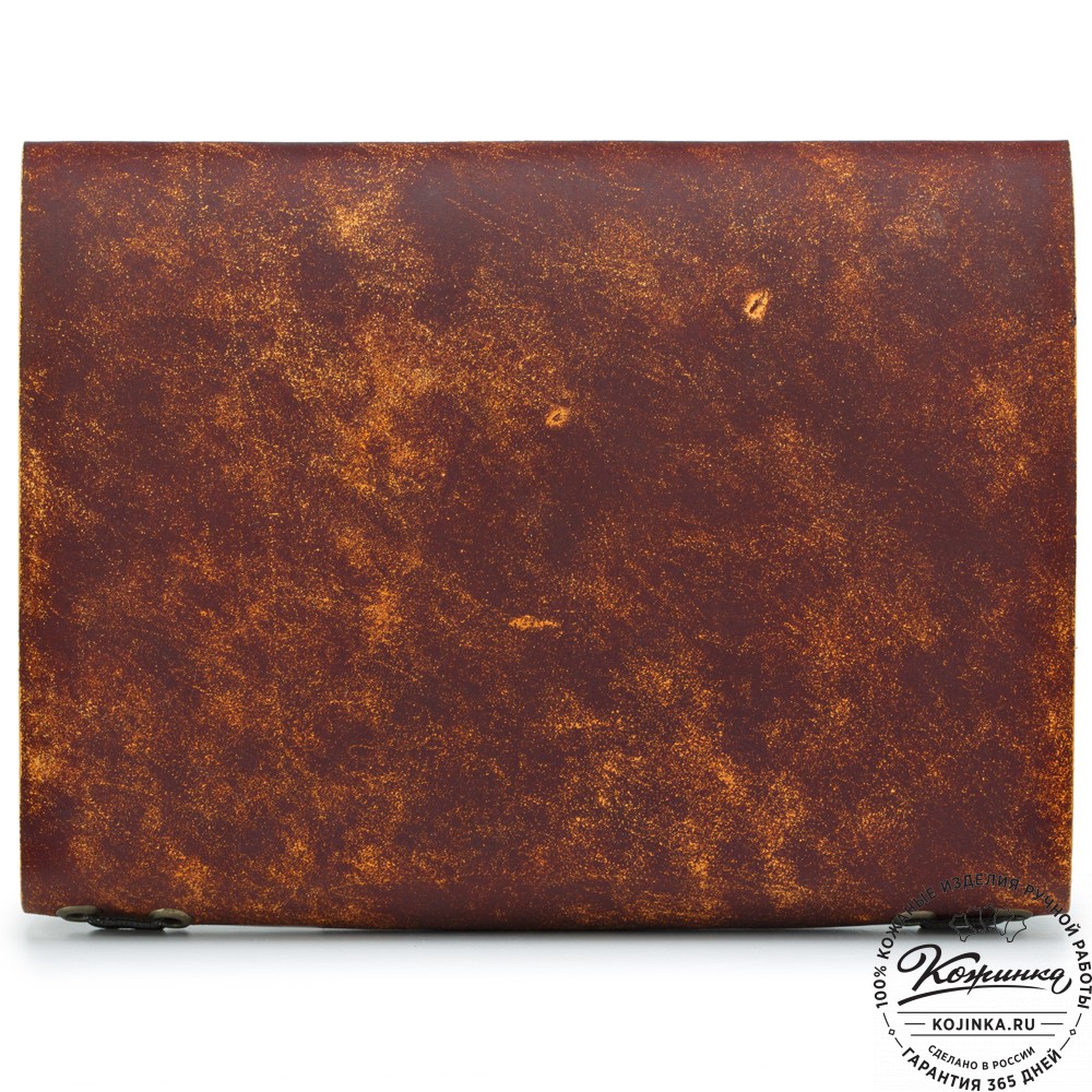 Обложка выполнена из толстой прочной кожи, а бумага внутри - сменная. Это может быть любая бумага формата А4, сложенная пополам. Удобное крепление на резинке позволяет легко и быстро менять бумагу.