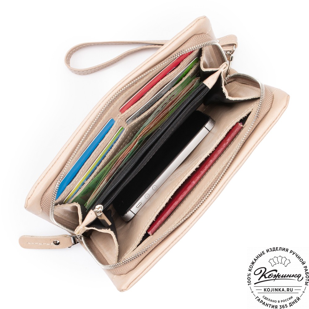 Внутри два открытых отделения для купюр, паспорта или телефона. Между ними карман на молнии для хранения мелочи.