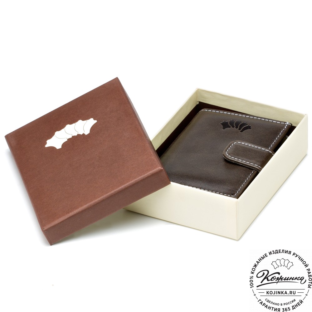Портмоне, как и вся коллекция, выполнено в мягкой, но достаточно толстой коже высокого качества. Фиксируется в закрытом состоянии на хлястик с кнопкой.