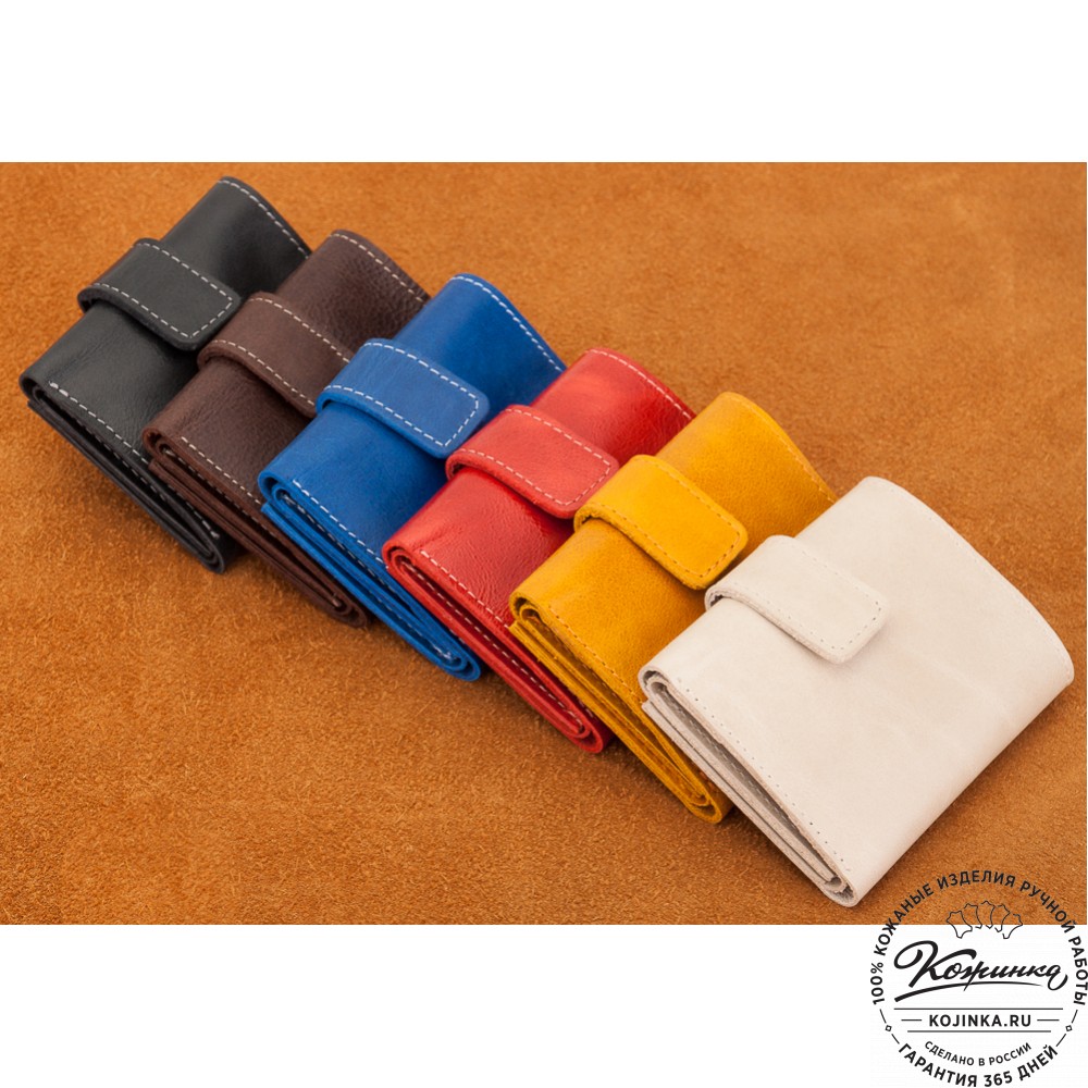 Этот купюрник в три сложения закрывается на хлястик с кнопкой. Внутри распологаются: откидное отделение для купюр и три кармана для карт.