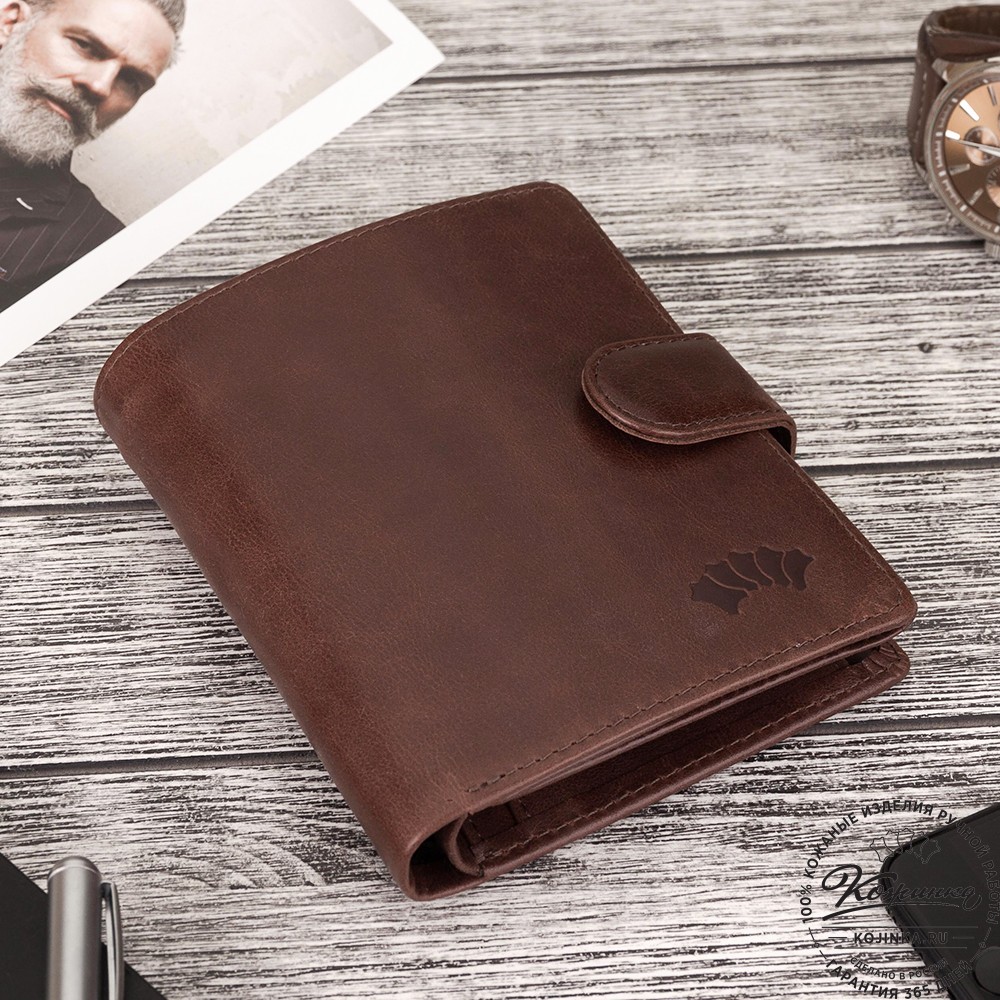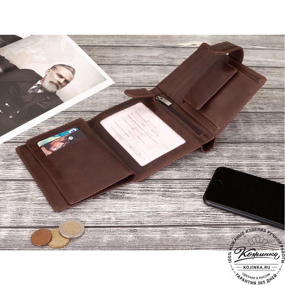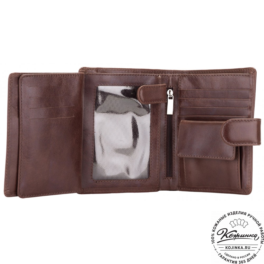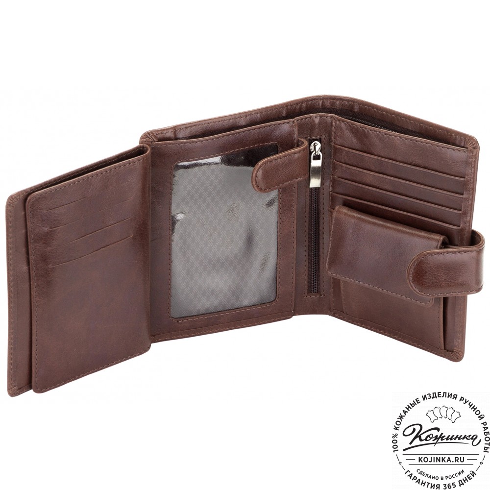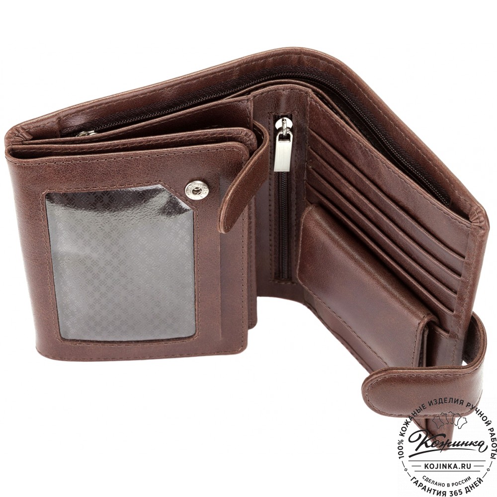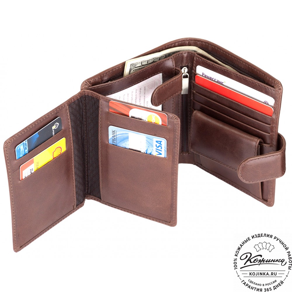 Эта модель очень функциональна - множество отделений позволяет удобно расположить большое количество кредитных карт и купюр, а также водительское удостоверение. Дополнительный отсек для мелочи. Портмоне закрывается на язычок с кнопкой.