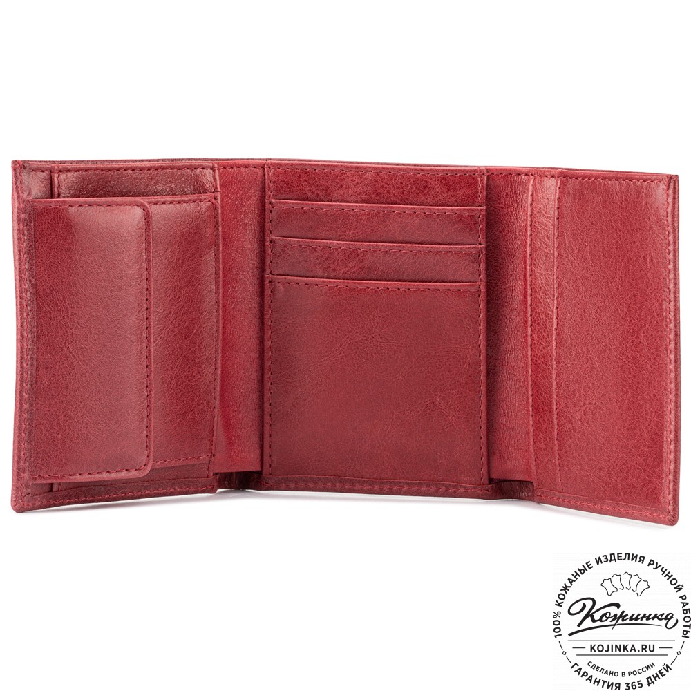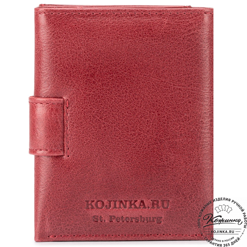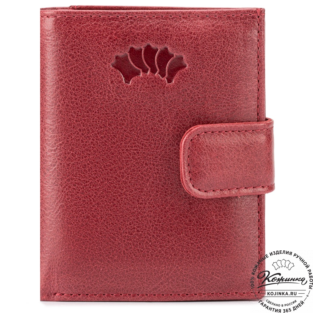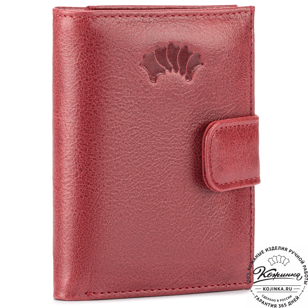 Портмоне, как и вся коллекция, выполнено в мягкой, но достаточно толстой коже высокого качества. Фиксируется в закрытом состоянии на хлястик с кнопкой.