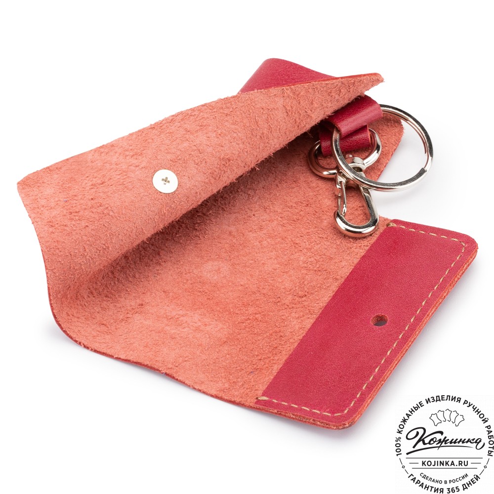 Внутри на кожаных петлях расположены металлическое кольцо для ключей и небольшой металлический карабин.
