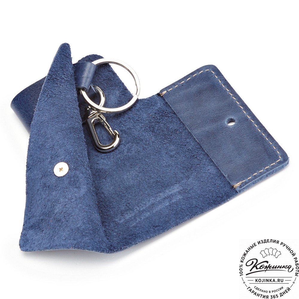 Внутри на кожаных петлях расположены металлическое кольцо для ключей и небольшой металлический карабин.