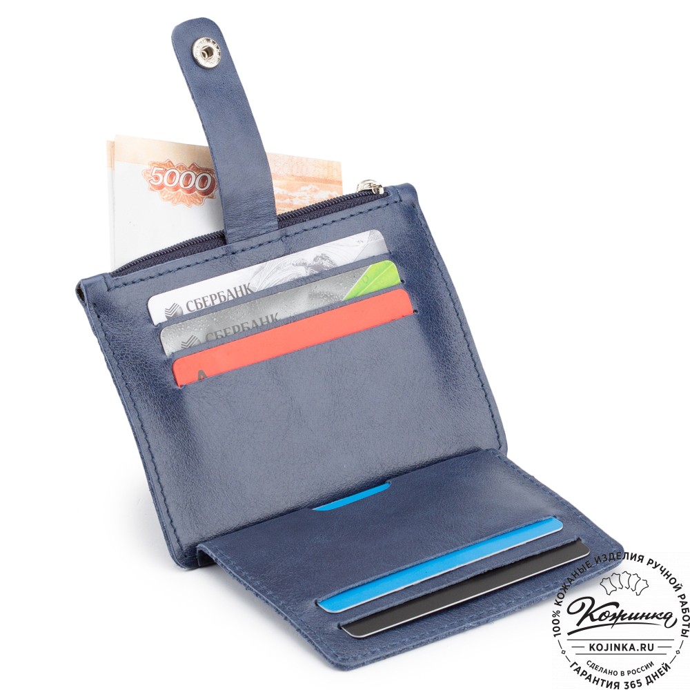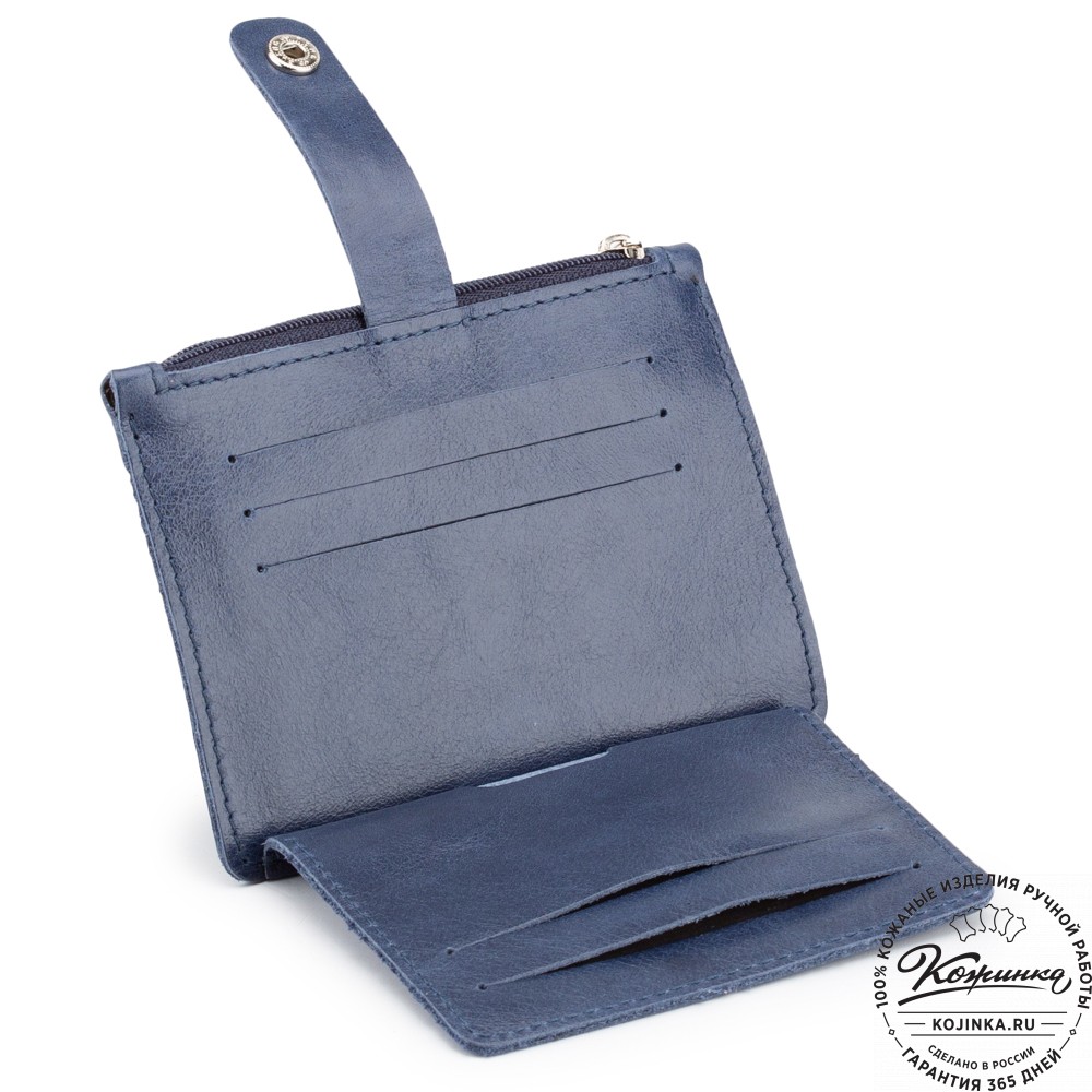 Откидная стенка визитницы скрепляется с основной часть хлястиком на кнопке.