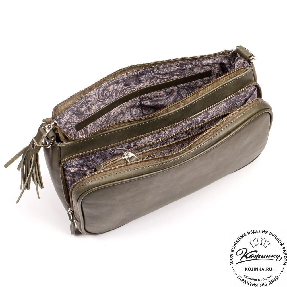 Все три отделения сумочки закрываются на молнию и имеют тканевую подкладку с узором.
