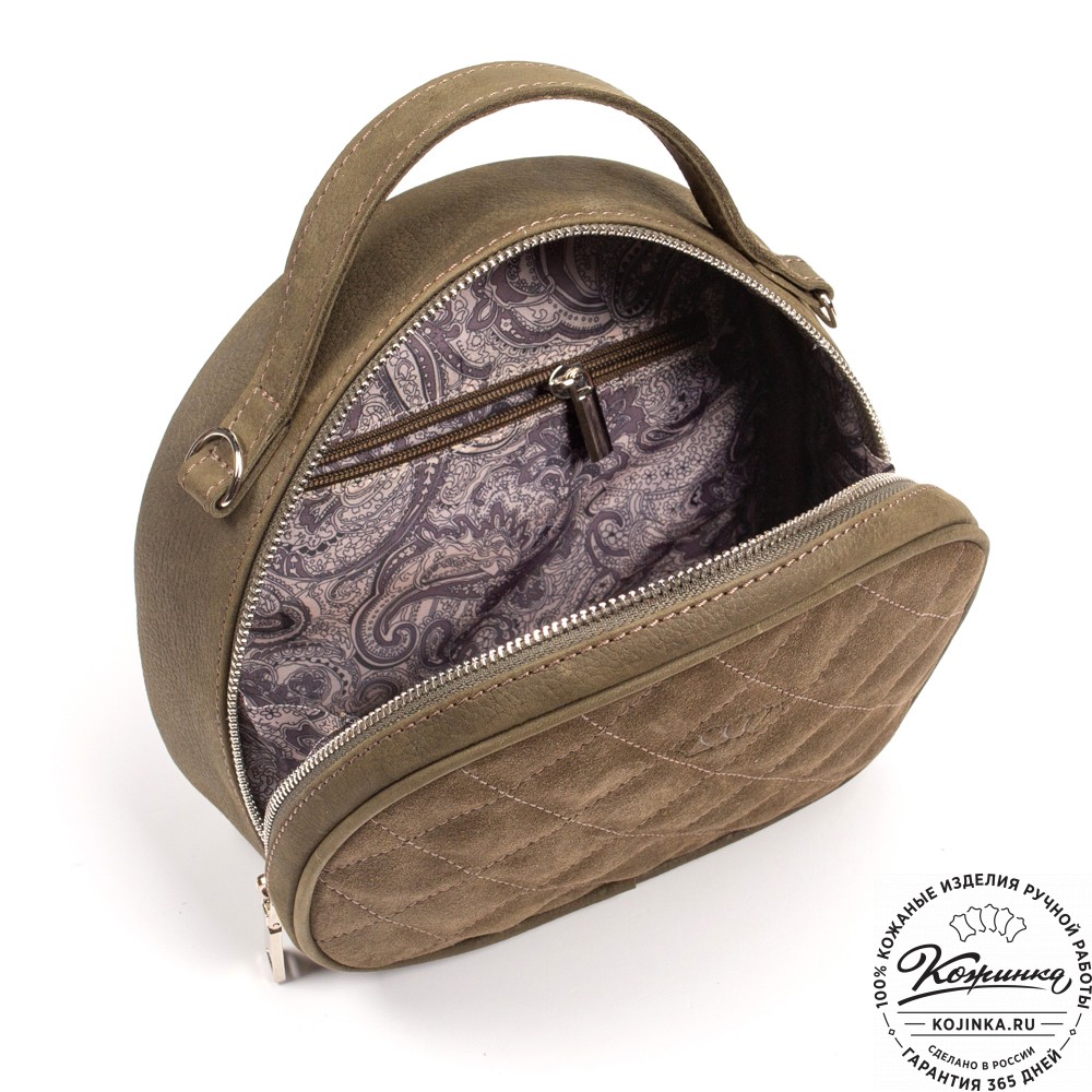 Основное отделение закрывается на молнию. Внутри есть карман на молнии и открытый кармашек. Подкладка выполнена из прочной ткани с узором.