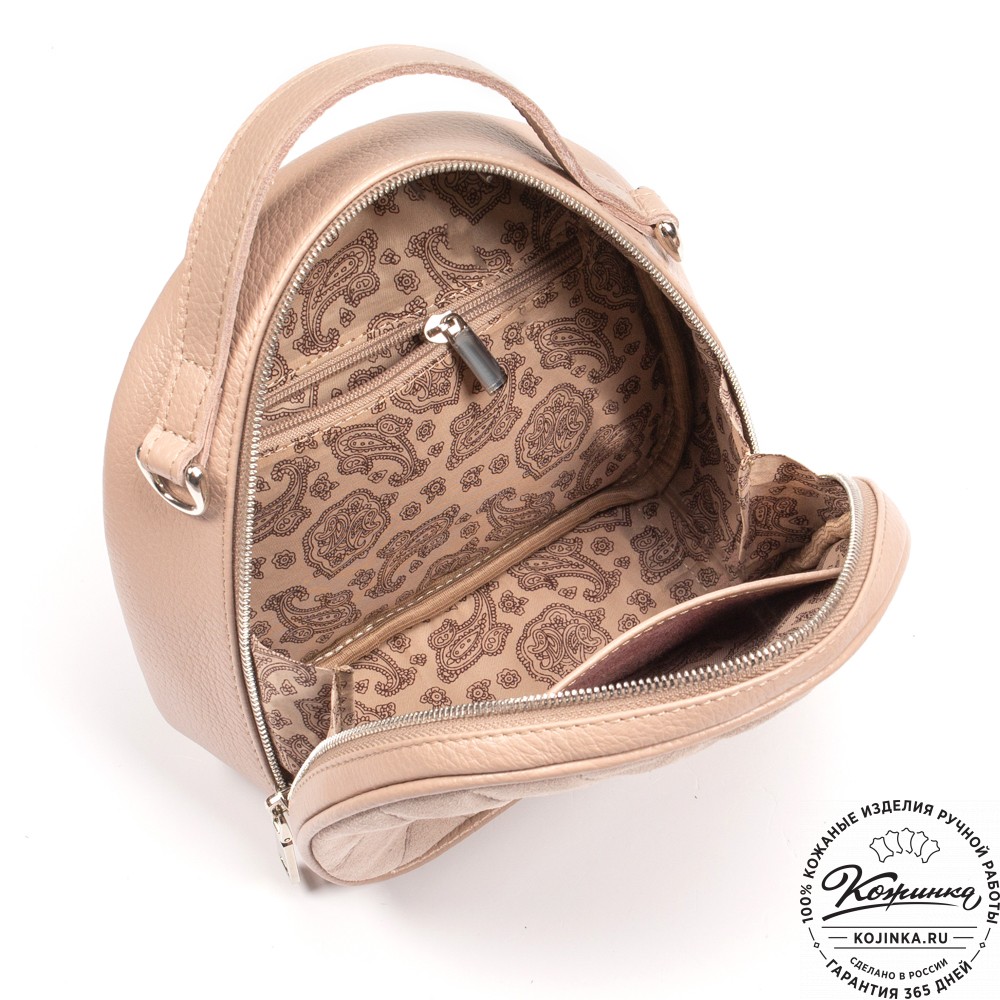 Основное отделение закрывается на молнию. Внутри есть карман на молнии и открытый кармашек. Подкладка выполнена из прочной ткани с узором.