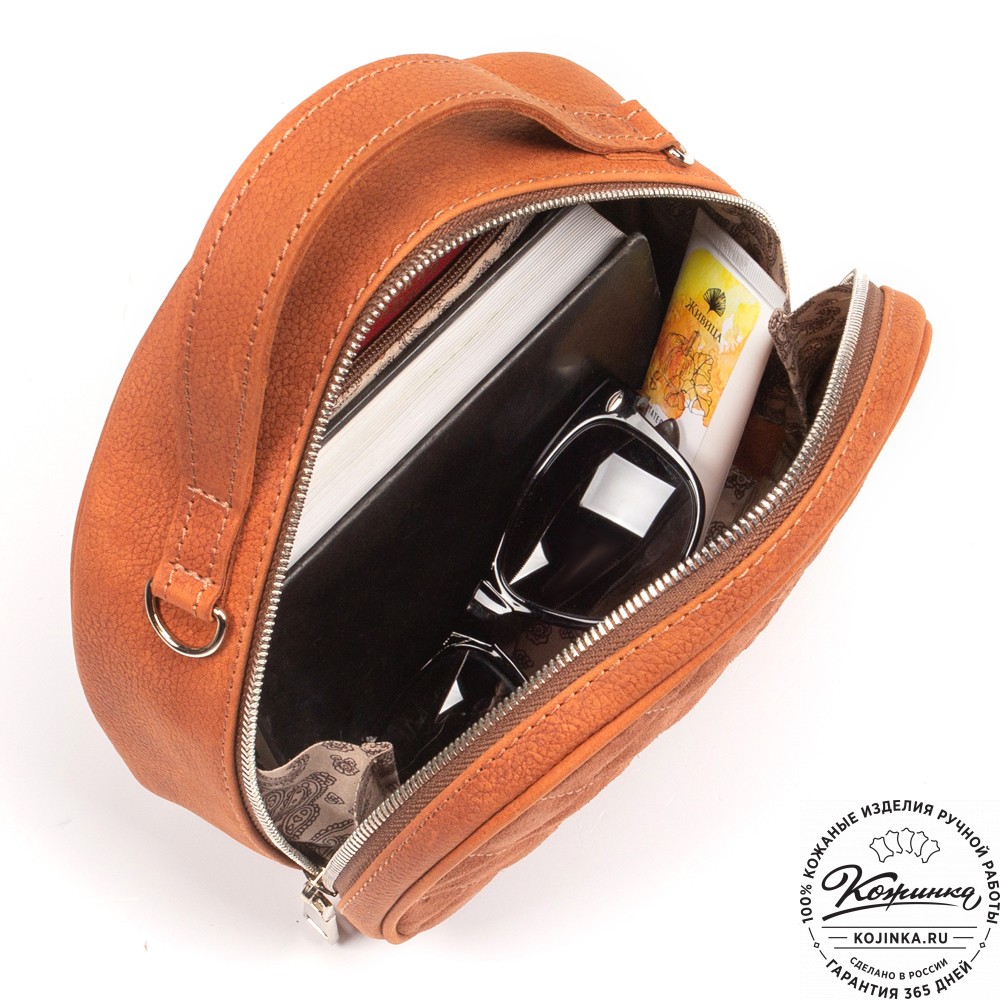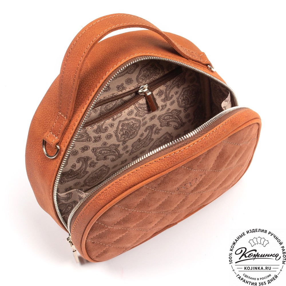 Основное отделение закрывается на молнию. Внутри есть карман на молнии и открытый кармашек. Подкладка выполнена из прочной ткани с узором.