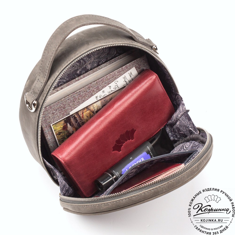 Основное отделение закрывается на молнию. Внутри есть карман на молнии и открытый кармашек. Подкладка выполнена из прочной ткани с узором.