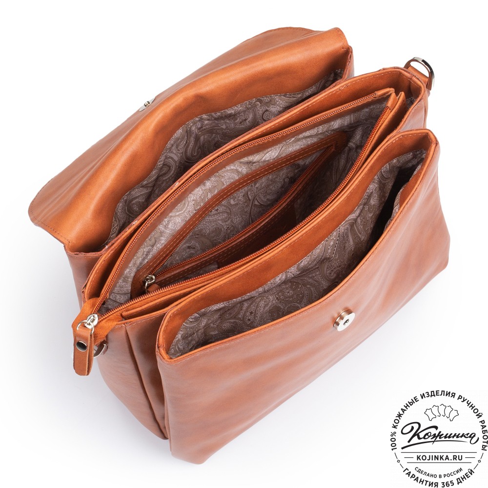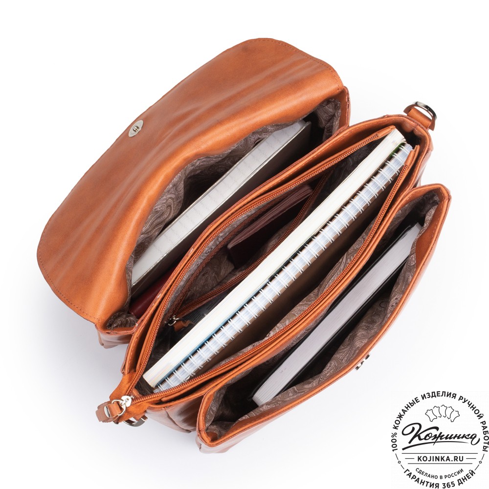 Сумка изготовлена из мягкой натуральной кожи высокого качества. Подкладка внутри выполнена из прочной ткани с узором.