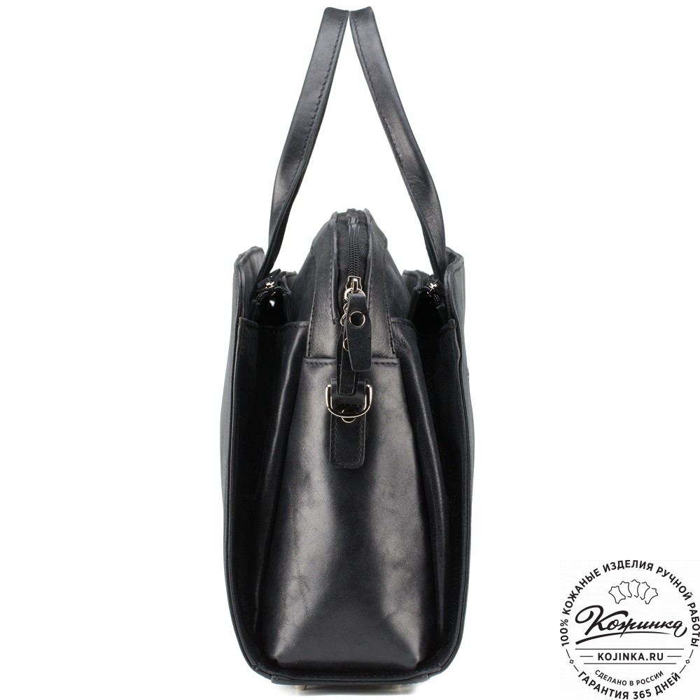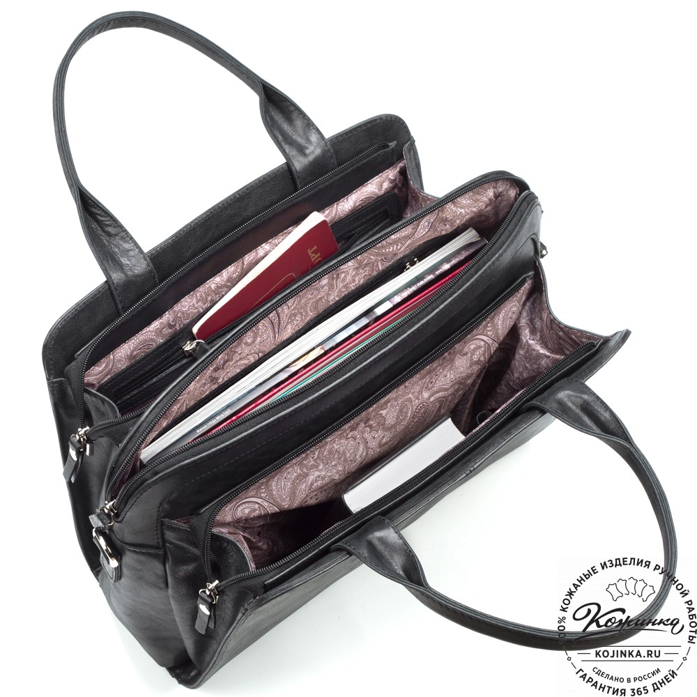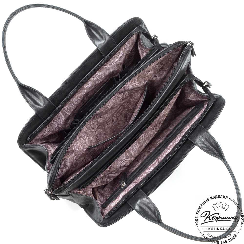 Женская кожаная сумка "Батерфляй" (чёрная) – вместительная сумка с тремя автономными отделениями, в которых можно удобно разместить все, что необходимо, включая документы формата А4 и ноутбук.