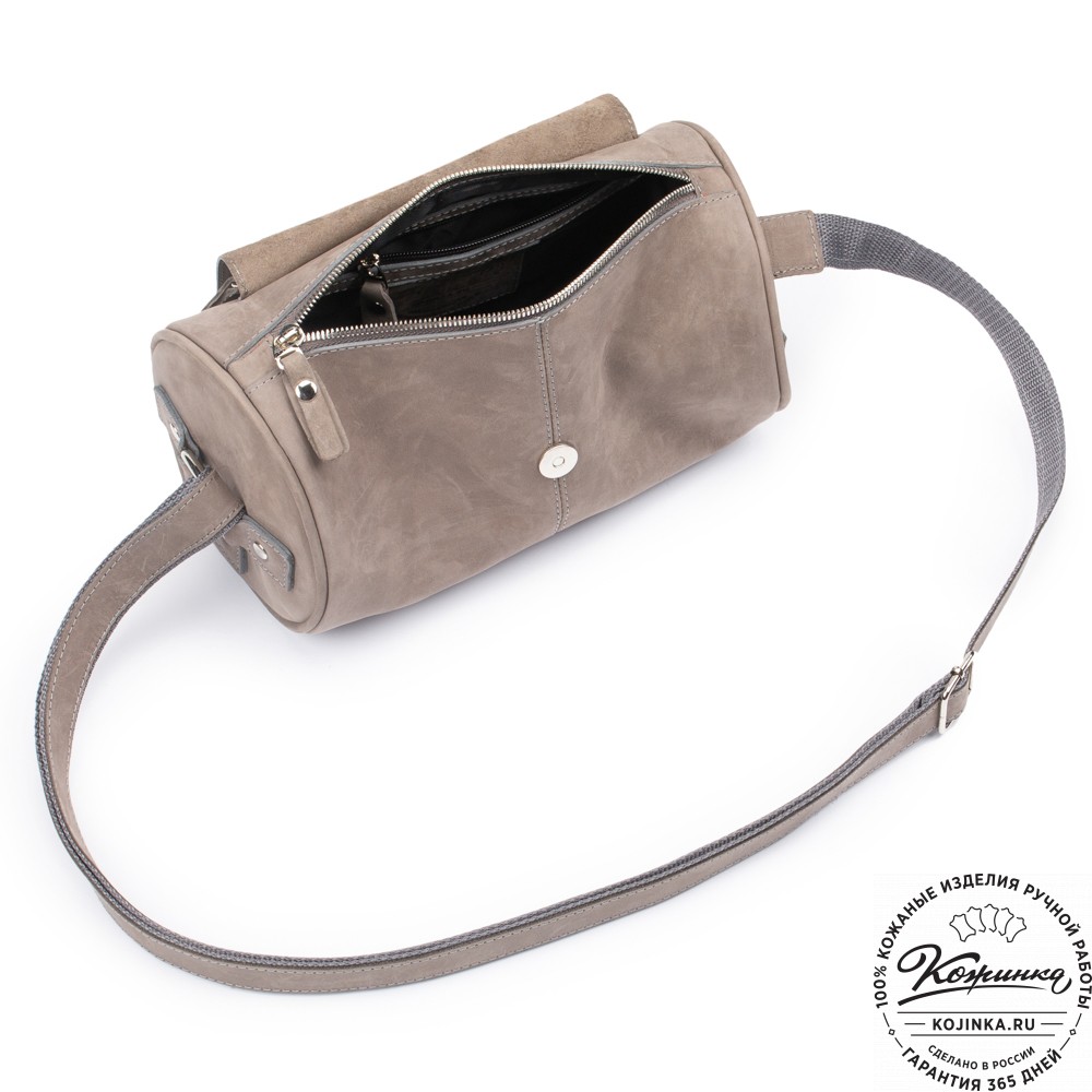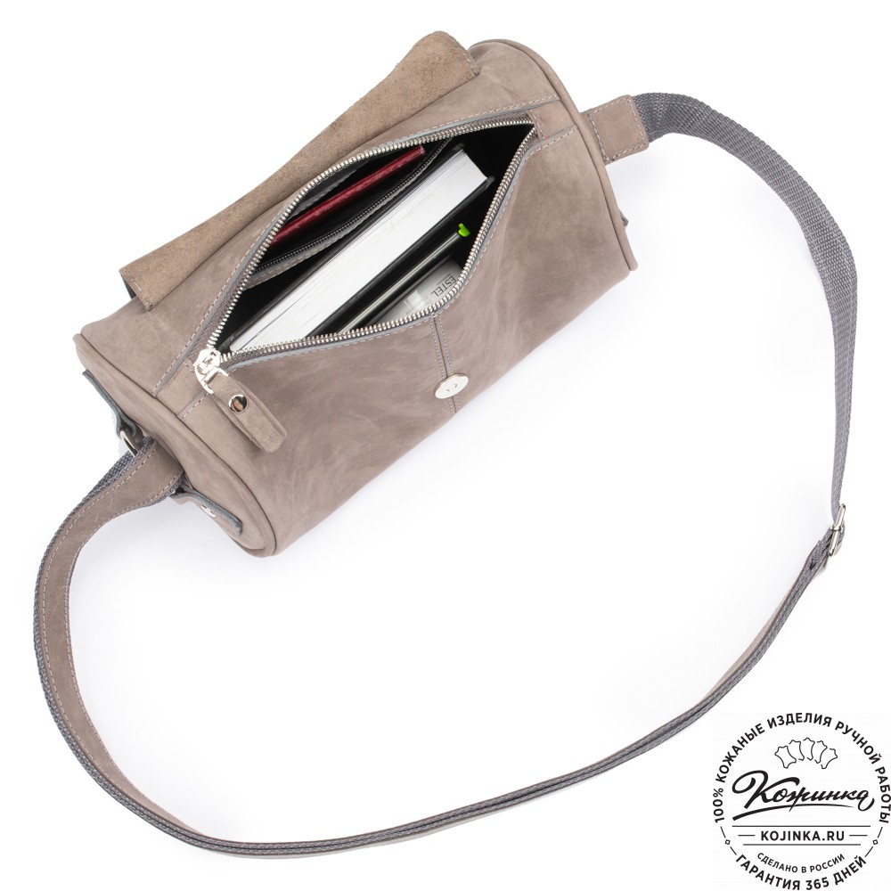Плечевой ремень регулируется по длине, выполнен из кожи и усилен стропой для прочности.