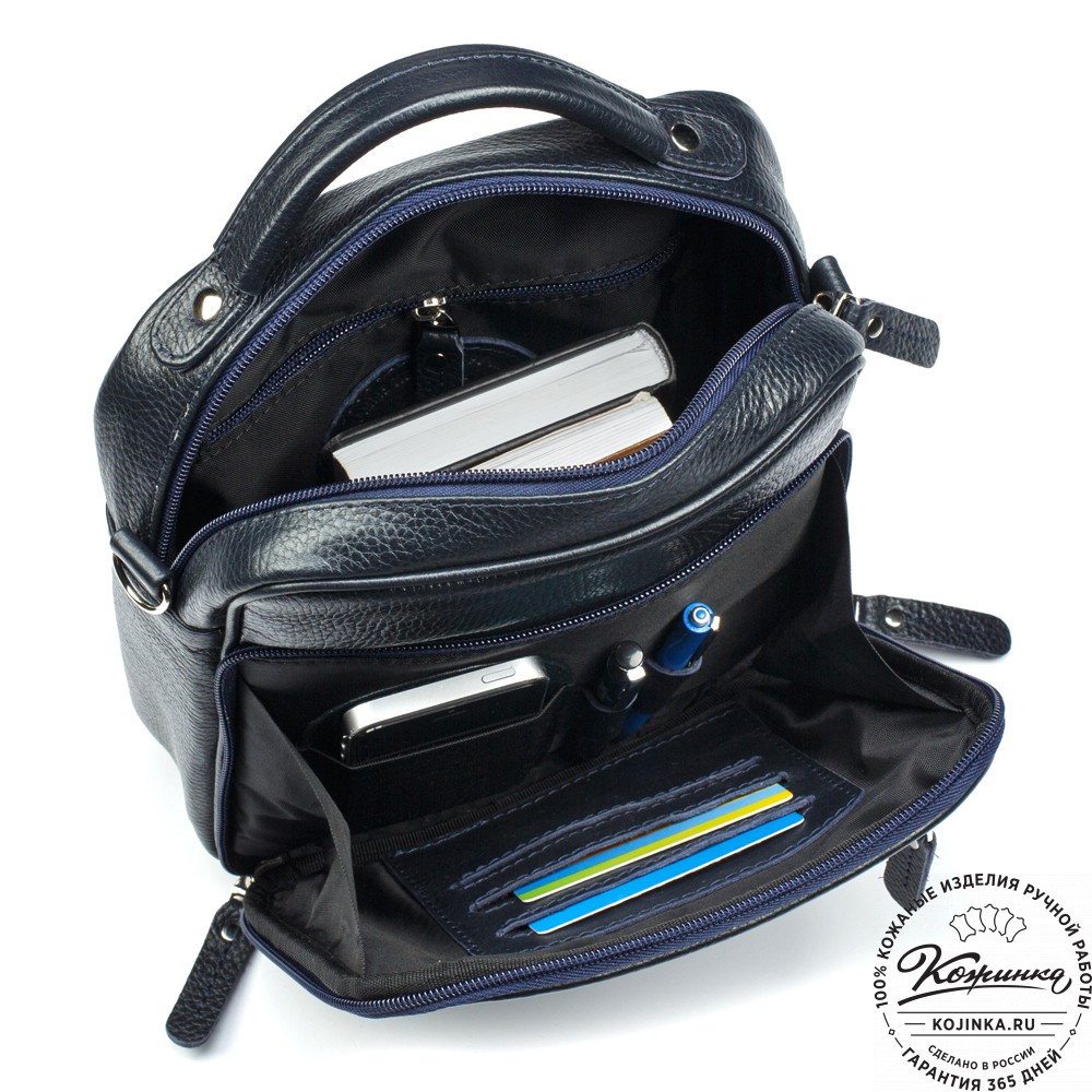 На лицевой стороне сумки расположен большой накладной карман на молнии, а за ним еще один кармашек, так же на молнии. Внутри большого кармана есть кармашки для карт, ручек и телефона. Очень удобно!
