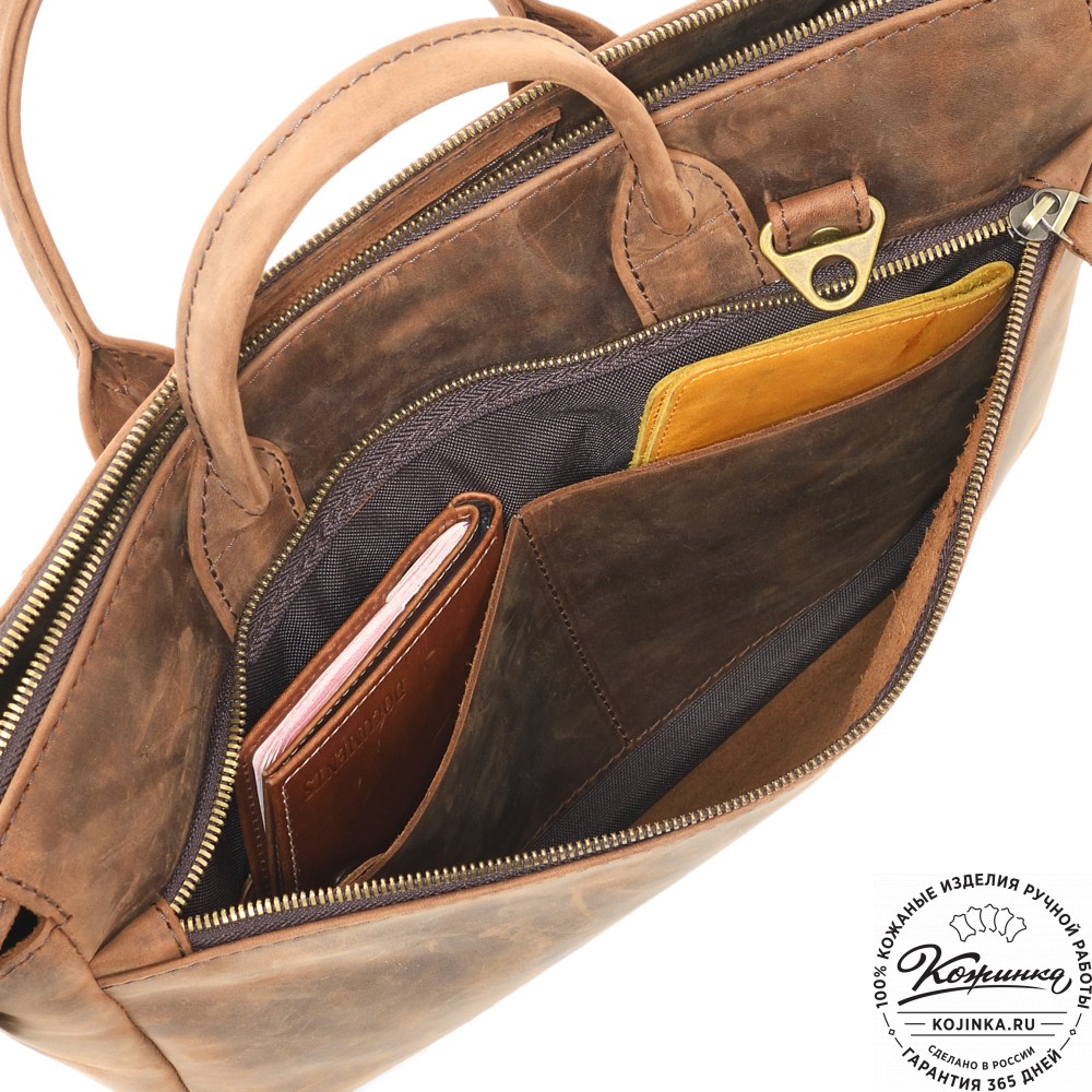 Основное отделение имеет отдельный отсек для бумаг А4, внутри два кармана на молнии для ценных вещей и документов. На лицевой внешней стороне-2 кармана на молнии и удобный карман для телефона, который закрывается сверху на кожаный клапан и кнопку. На другой стороне сумки расположен внешний карман по всей длине сумки на молнии.
