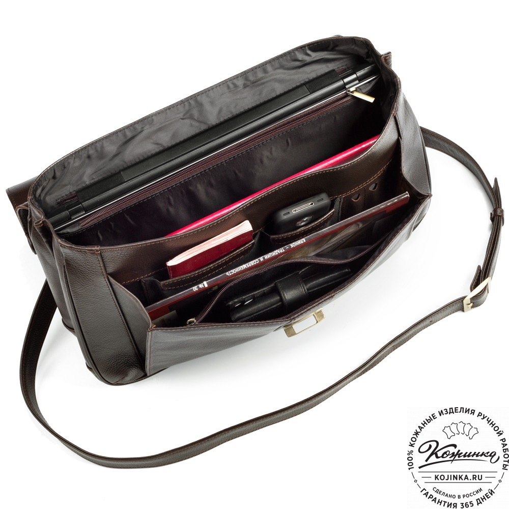Портфель изготовлен из высококачественной натуральной кожи и прочной фурнитуры.