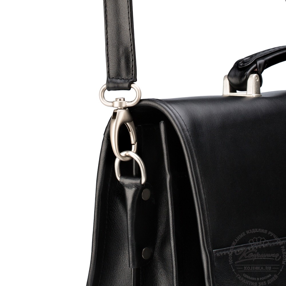 У портфеля удобная кожаная ручка и съемный плечевой ремень из кожи, который крепится по бокам на небольшие карабины. Ремень регулируется по длине ременной пряжкой, свободный конец ремня фиксируется кожаным кольцом.