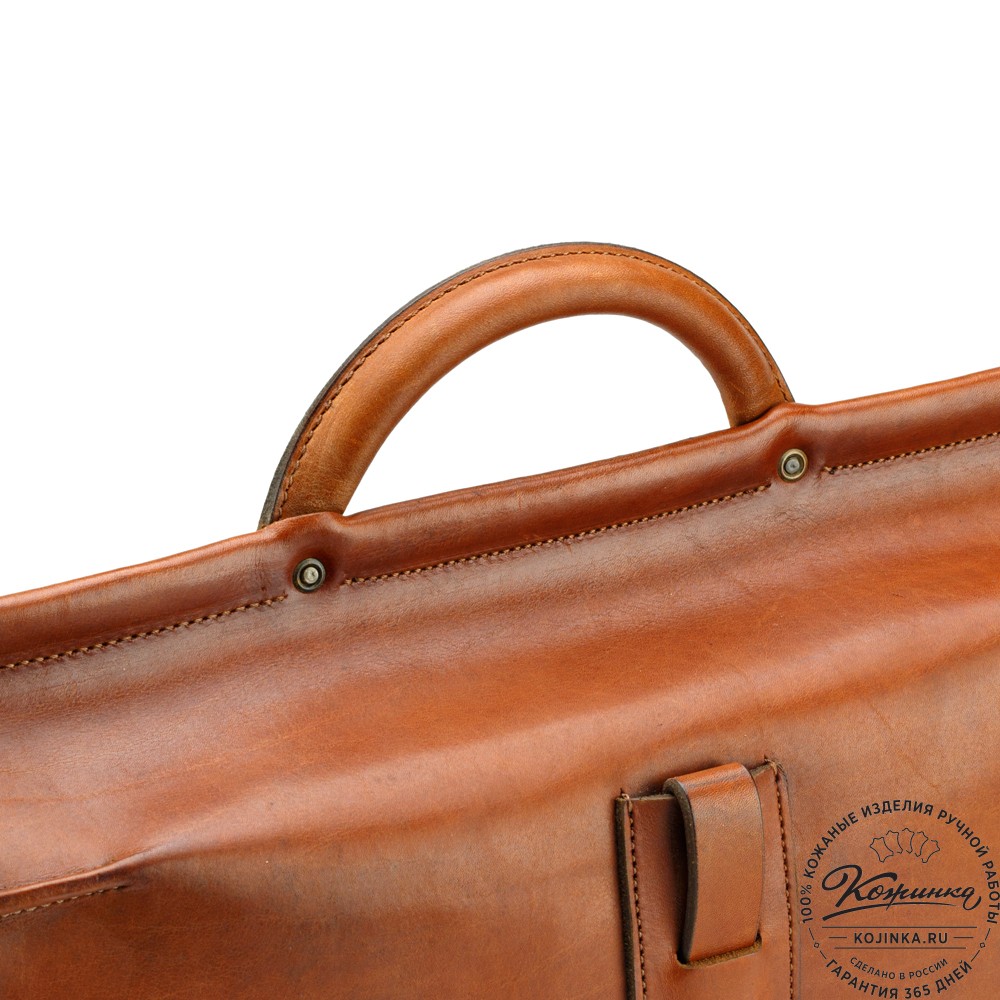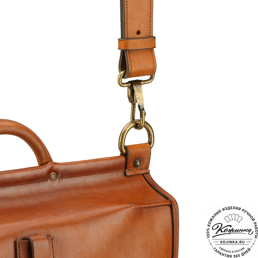 У портфеля удобная кожаная ручка и прочный плечевой ремень из толстой кожи. Ремень съемный, крепится на карабины, регулируется по длине.