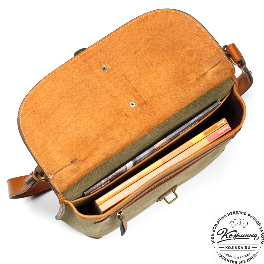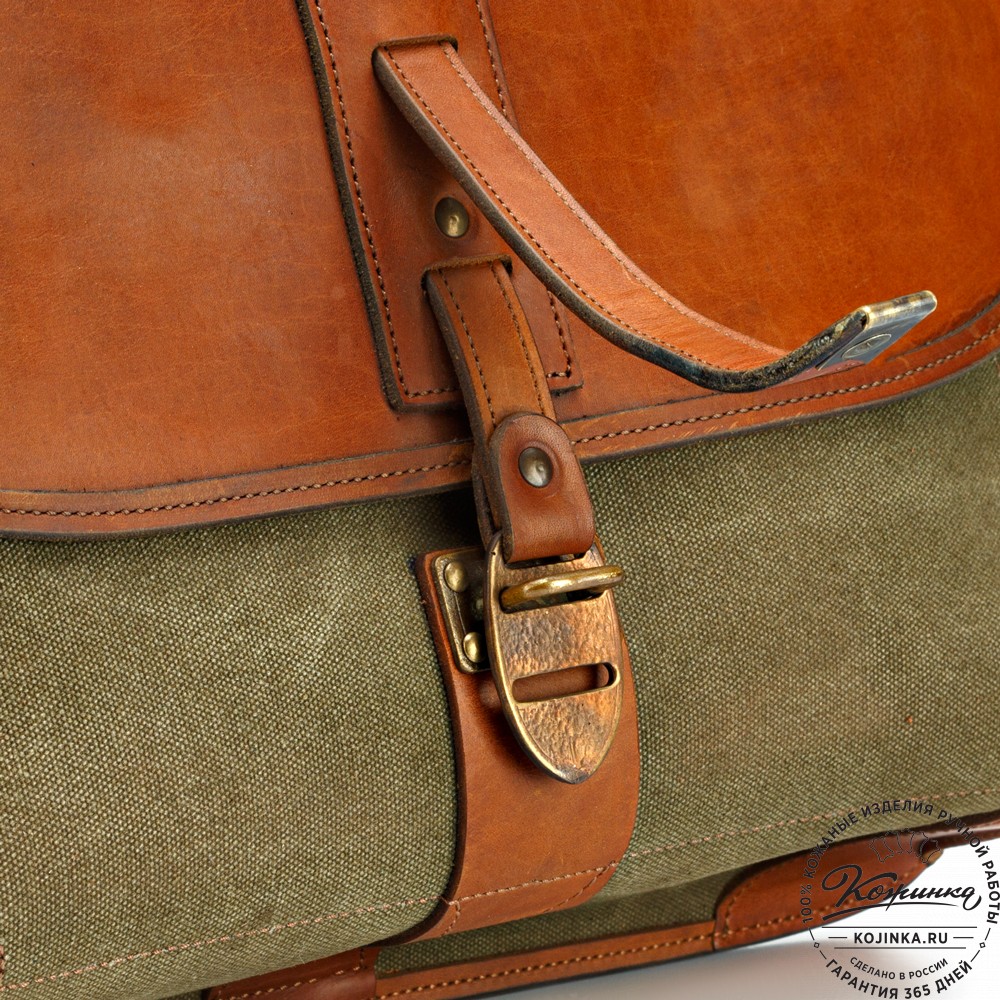 Сверху портфель закрывается клапаном на оригинальную металлическую застежку и кожаный хлястик.