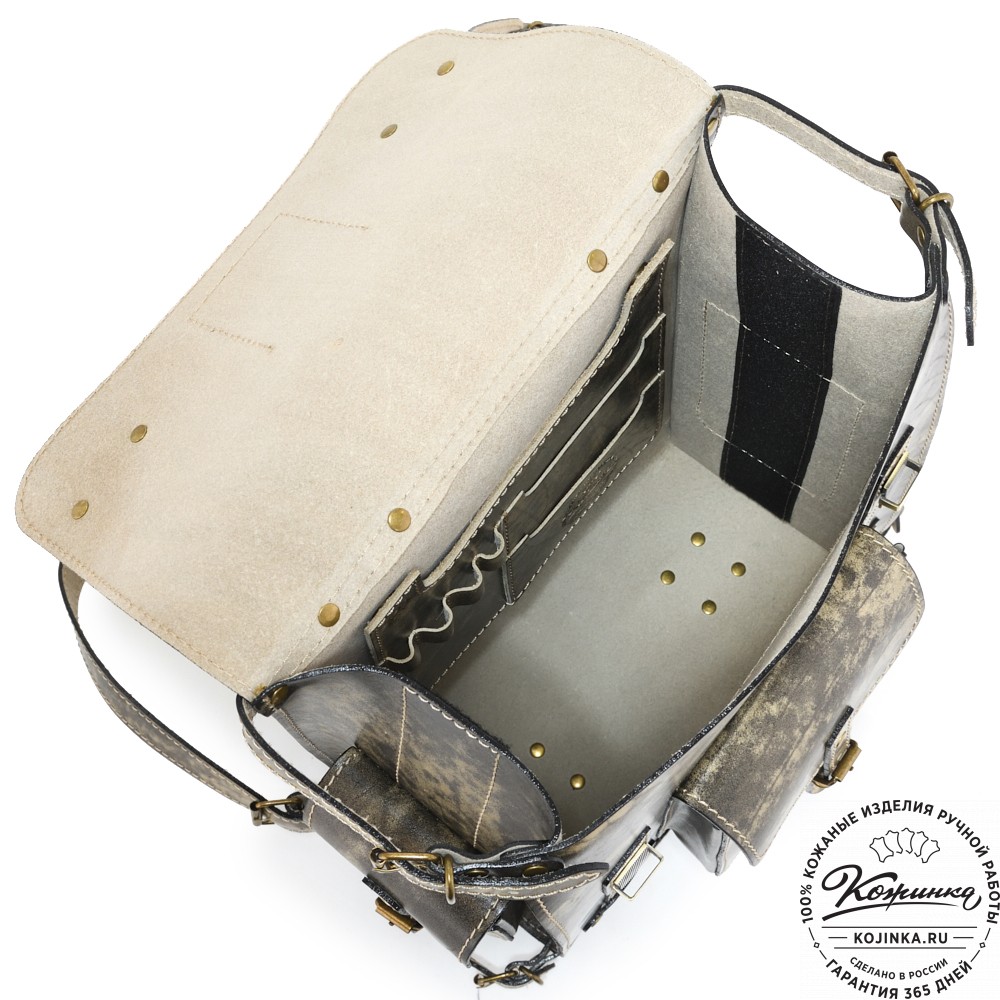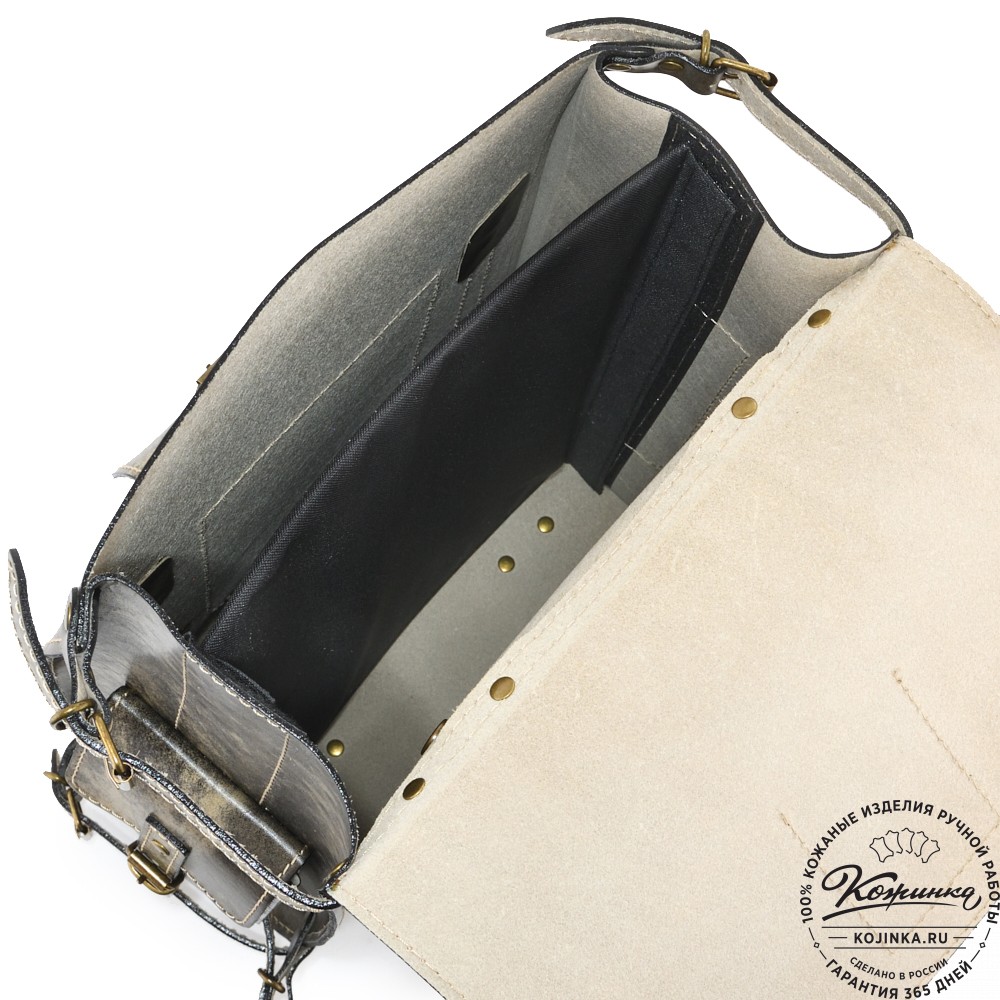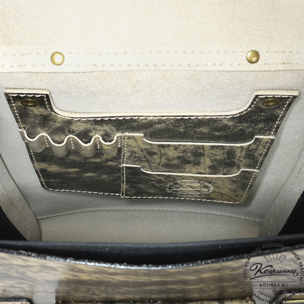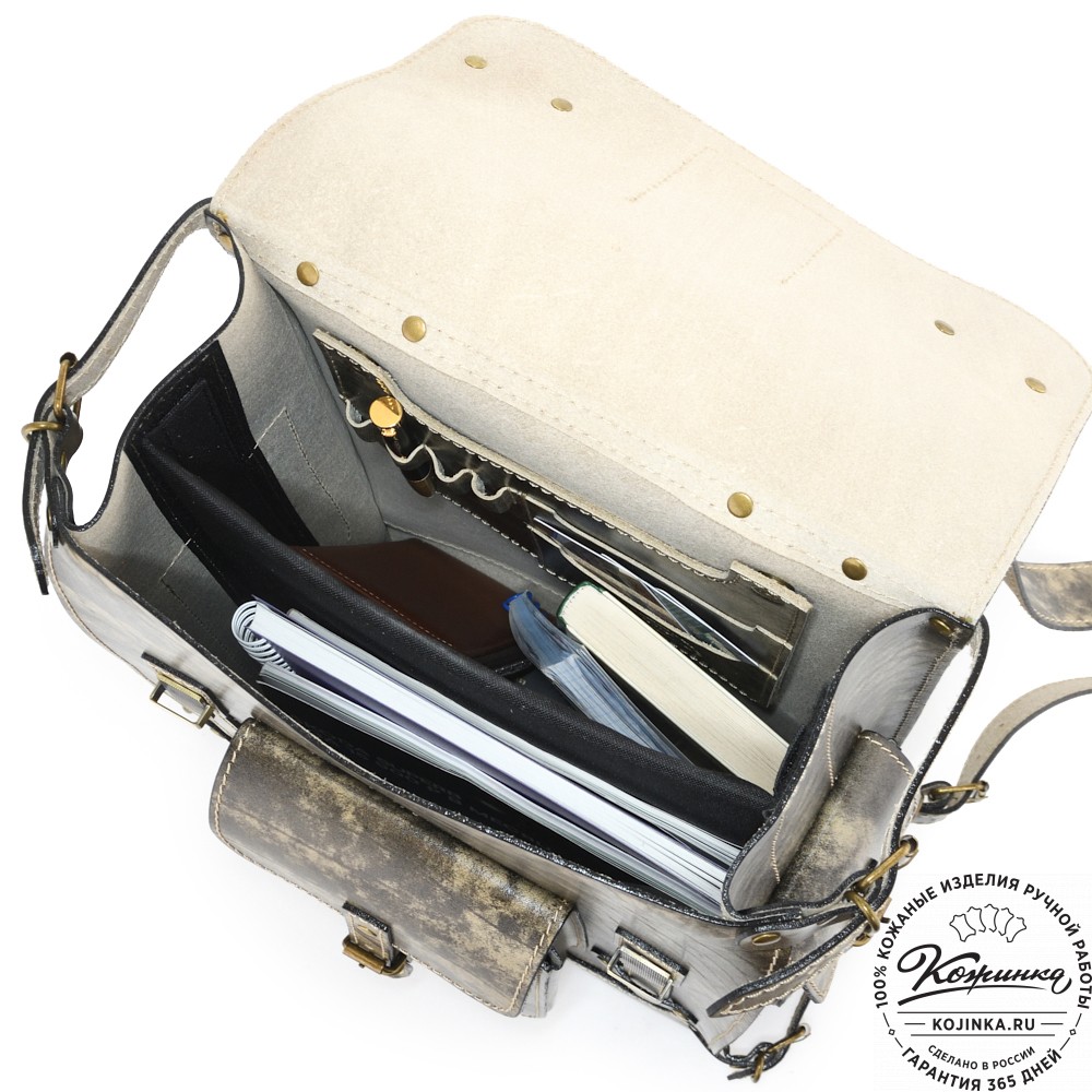 Внутри одно отделение без подкладки. Съемная перегородка позволяет разделить отделение на 2 секции. На задней стенке внутри расположен съемный мини-органайзер с удобными кармашками и слотами для ручек.