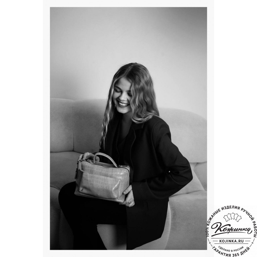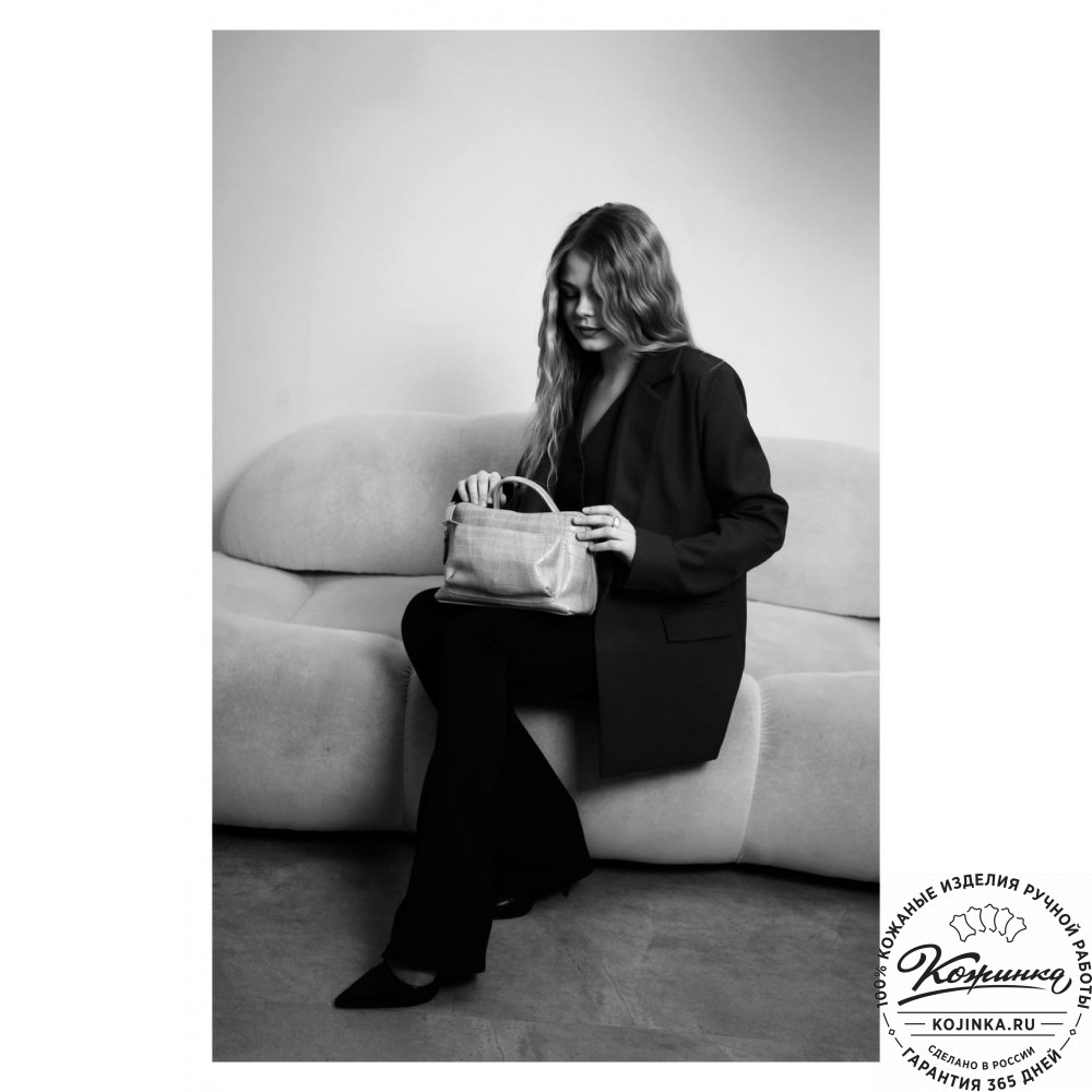 На модели представлена сумка "Крис" в цвете бежевый кроко.